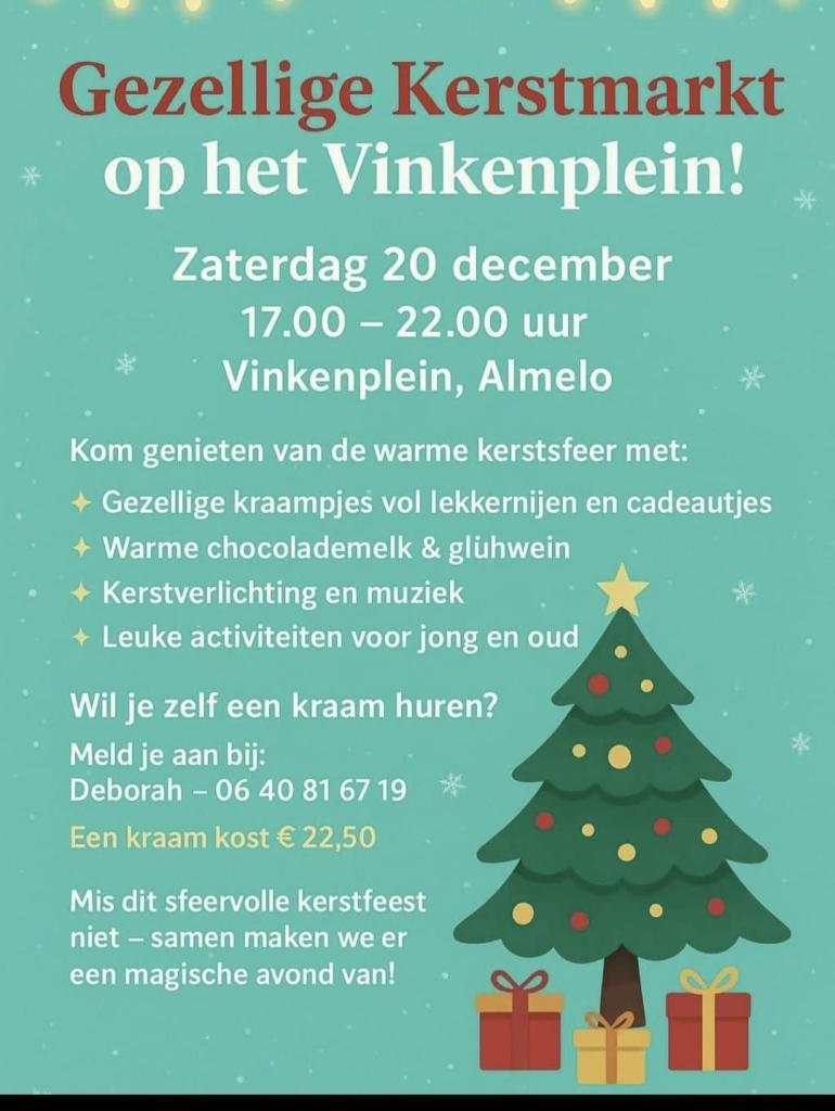 Wij willen graag een gezellige kerstmarkt organiseren op het Vinkenplein. Dit voor de saamhorigheid van de mensen rondom het plein en in de wijk. Wij vinden het belangrijk dat er iets wordt georganiseerd waar iedereen aan kan deelnemen.