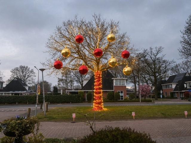 Van de bestaande grote bomen maken we kerstbomen met grote ballen, gekleurde stof om de stam en kerstverlichting. In totaal 10 bomen. Een warme uitstraling voor omwonenden en doorgaand verkeer.