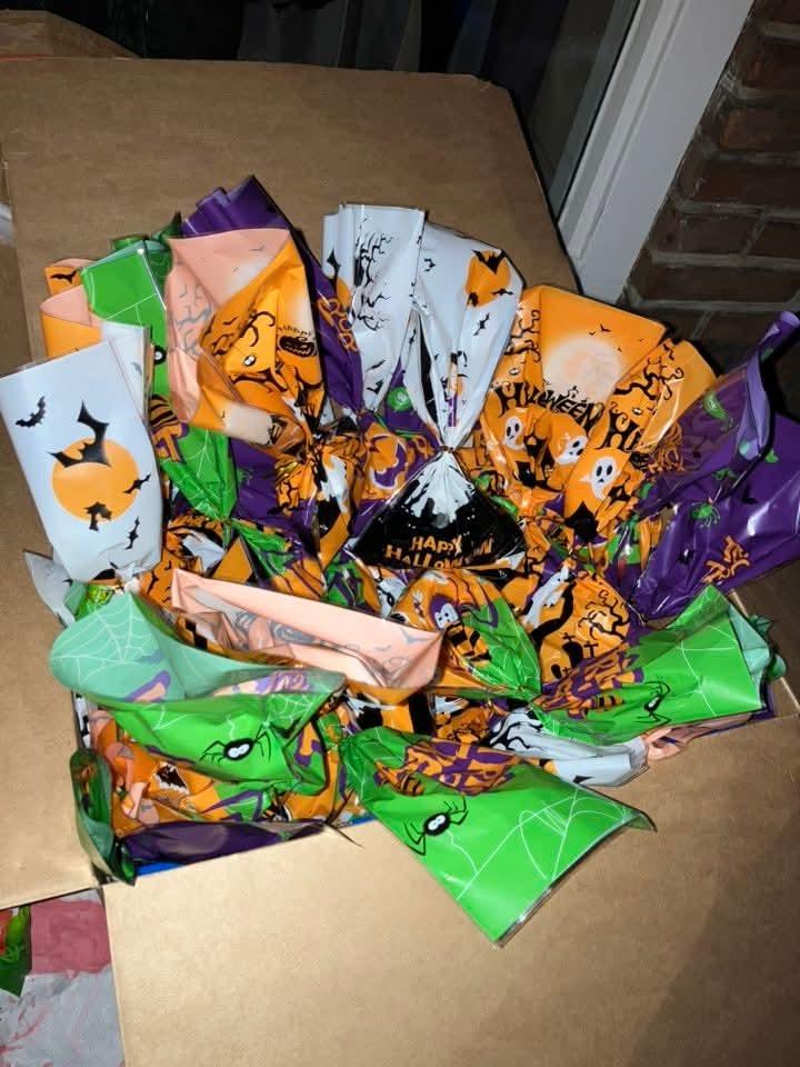 Elk kind kreeg een Halloween tasje om snoep in te doen. Daar zat ook al wat in.