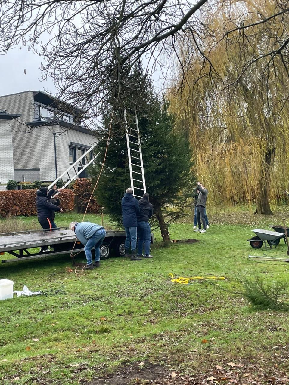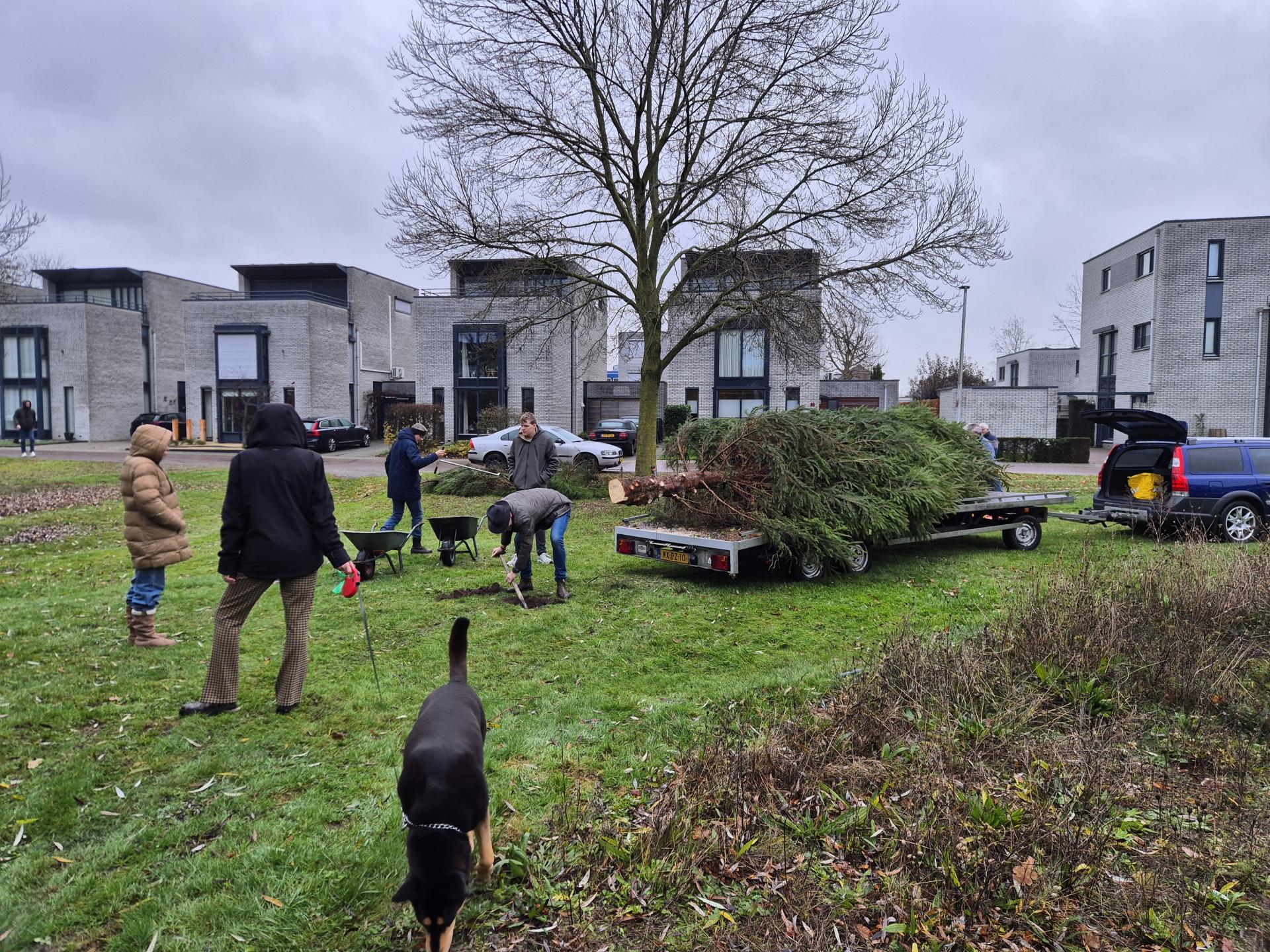 Eerst een goed gat gegraven en dan met vermeende kracht de boom direct van de aanhanger rechtop in het gat!