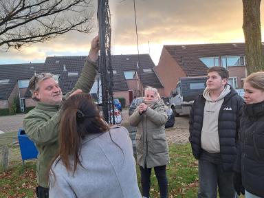 Er werd serieus (maar ook met veel humor) gewerkt aan het opzetten van de boom. Dat moest natuurlijk wel gebeuren bij licht... anders was het een andere interessante puzzel geworden.