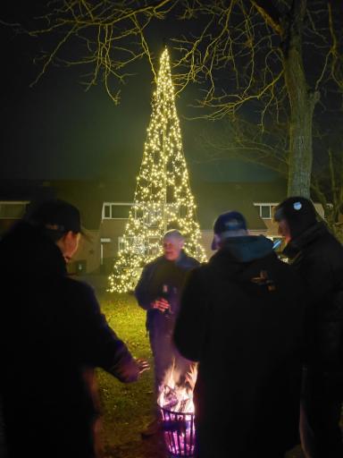 De verbindingsboom werd aangestoken (eh... het licht werd aangedaan). Het is een sier voor de straat. En het brengt de tongen los. “Hoe gaat het?” “Wat ga je doen met de kerstdagen” en er werd natuurlijk even stilgestaan bij het afgelopen jaar. Gekke snoeten werden getrokken toen we op de foto gingen.