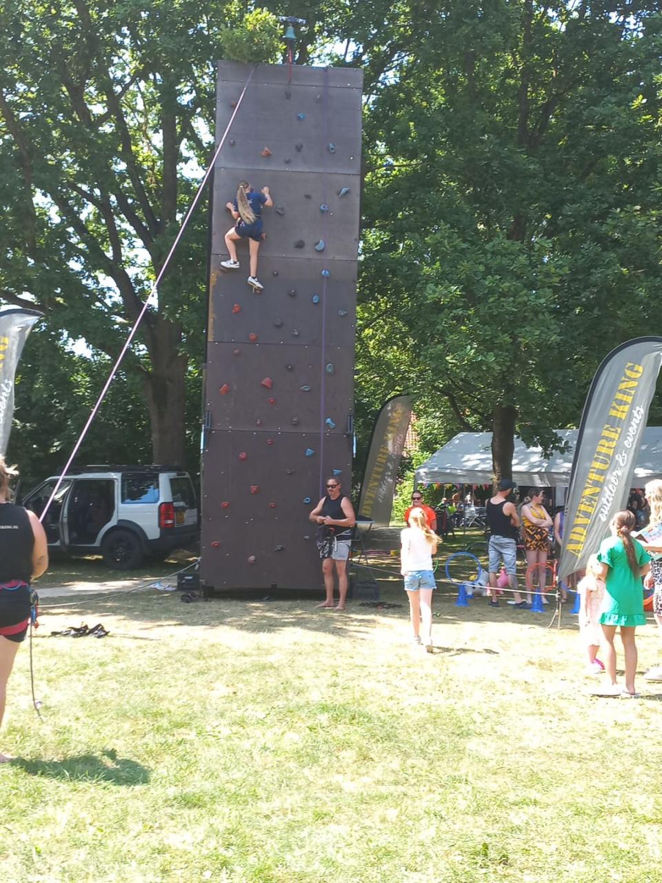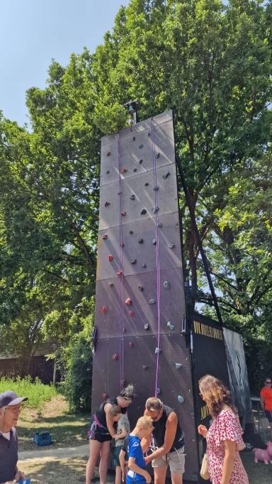 De klimwand was een succes. Doorlopend zag je mensen omhoog klimmen. Het was blijkvaar een interessante activiteit voor jong en oud(er).